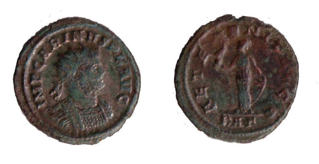 AE antoninian. L: hlava zprava s paprskovou korunou, IMP CARINVS PF AVG, R: stojící Aeternitas vlevo, AETERNIT AVG, minc. ?, 2,26 g, zbytky postříbření. S 3363 nep. kor.