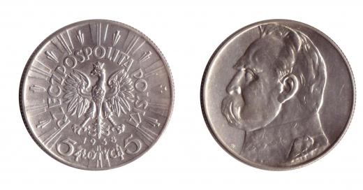 5 złotych 1938 Pilsudski =R=, Ag .750. KM 28