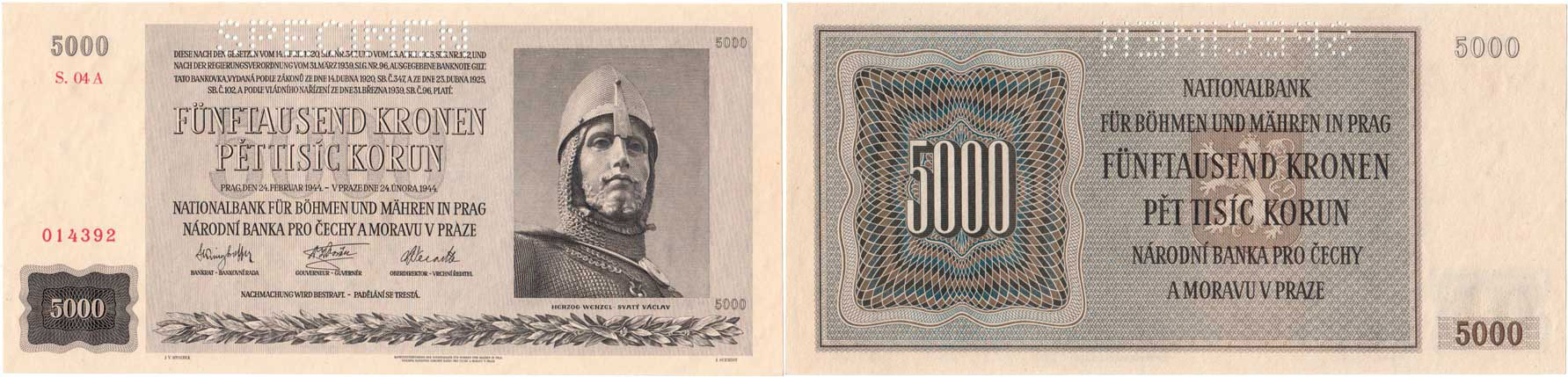 5000 Koruna 1944 - série 04A, BHK.41, He.44a.s1, nahoře perforace "SPECIMEN"