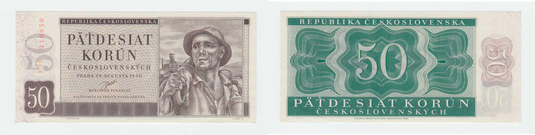 50 Koruna 1950, série A08, BHK.85a, He.93a "neperf."