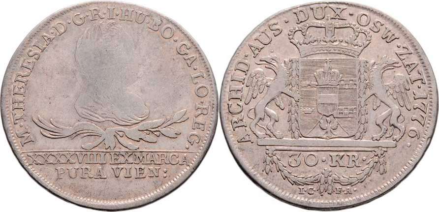 30 Krejcar 1776, IC-FA, Vídeň pro Halič, N.150, 9.141g, střed nedoražen, vlas.rysky, patina