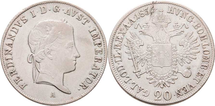 20 Krejcar 1836 A - FERDINANDVS, Vídeň, 6.643g, vada materiálu na hr., nep.hr., nep.rysky, patina R!