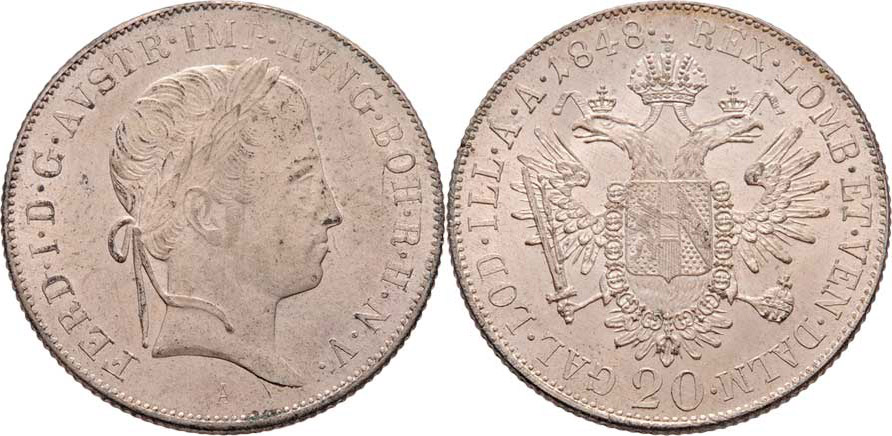 20 Krejcar 1848 A, Vídeň, 6.687g, nedor., nep.just., nep.hr., nep.rysky, pěkná patina, téměř