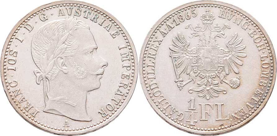 1/4 Zlatník 1865 A, 5.316g, pěkná patina RR!