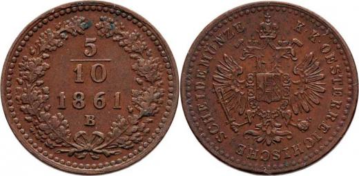 5/10 Krejcaru 1861 B, 1.541g, krásná patina, téměř