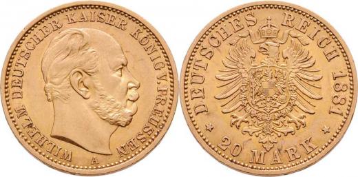 20 Marka 1881 A, Berlín, KM.505 (Au900), 7.953g, nep.hr., nep.rysky, pěkná patina