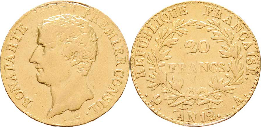 20 Frank, rok 12 (= 1804) A, KM.651, 6.380g, na hraně stopy po uchycení, dr.rysky
