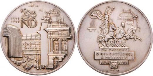 Národní divadlo - Za zásluhy o rekonstrukci 1983 - budovy ND, emblém, vročení / triga, stará budova ND, nápis, Sign., Ag900, 40mm, 32.966g, nep.hr., patina