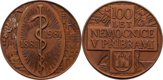 Příbram - 100 let nemocnice 1881/1981 - Aeskulapova hůl, vročení, dominanty města / nápis a městský znak na kříži, ratolesti, Sign., patinovaný bronz 40 mm