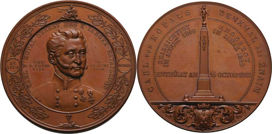 Znojmo - odhalení pomníku plukovníka Kopala 16.X.1853 - poprsí zpředu, dubový věnec, opis a nápis / pomník, městský znak, ornament, písmo, Sign., měď 64 mm, pat.
