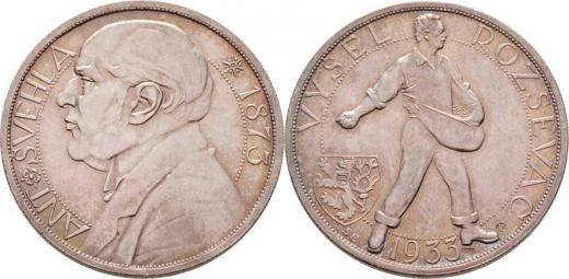 Antonín Švehla / Vyšel rozsévač 1933 - poprsí zleva, opis / rozsévač, malý znak ČSR, opis, Sign., Punc., Ag987, 30mm, 10.093g, PŠ.140, krásná patina