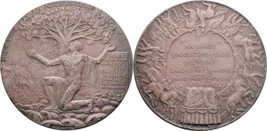 50.výročí položení zákl.kamene Národního divadla 1918 - muž a lípa v krajině, písmo / průvod vezoucí kámen, nápis, Sign., postř.zinek 75mm, OŠ.163, kor., karton