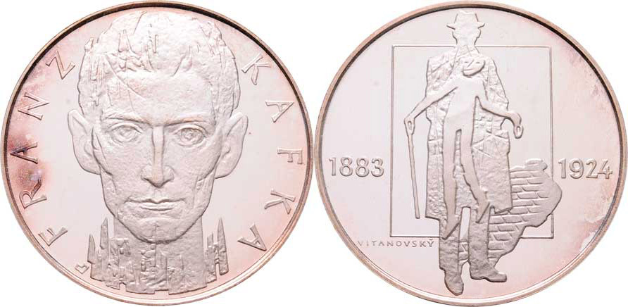 Franz Kafka (1883 - 1924) b.l. - poprsí zpředu, opis / dvě postavy, vročení, Sign., postříbř. bronz 40 mm, skvrnky