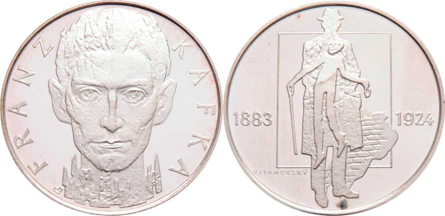 Franz Kafka (1883 - 1924) b.l. - poprsí zpředu, opis / dvě postavy, vročení, Sign., postříbř. bronz 40 mm, skvrnky, kapsle