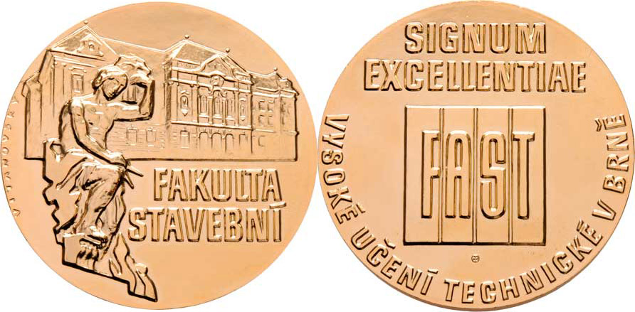 Brno - VUT - Fakulta stavební b.l. - průčelí budovy, socha a nápis / monogram, nápis a opis, Sign., pozlacený bronz 70 mm (cca 50 ks) R!