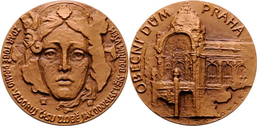 Praha - Obecní dům b.l. - secesní tvář z výzdoby Obecního domu, opis / průčelí Obecního domu, opis, Sign., patinovaný bronz 60 mm