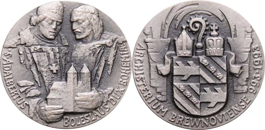 Břevnov - 1000 let kláštera 993/1993 - svatý Vojtěch a Boleslav II., opis / znak, klenba, opis, Sign., patinované Ag900, 60mm, 81.742g R!