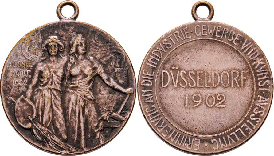 Düsseldorf 1902 - Průmyslová, živnostenská a umělecká výstava - alegorie / nápis a opis, Nesign., postříbř. bronz 31 mm s původním letovaným ouškem, dr.rysky