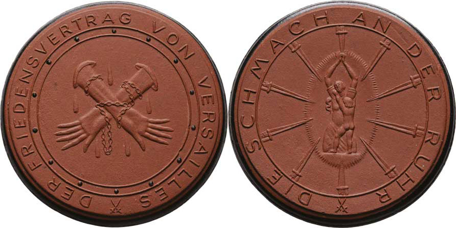 Německo (1919) - mírová smlouva ve Versailles - ruce svázané řetězy, opis / dvě postavy v kruhu mečů, opis, míšeňský hnědý porcelán 50 mm s černým okrajem