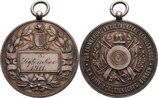 Bensen (Benešov) 1911 - střelecká královská cena - klobouk, terč, pušky, opis/ znak a udělení ve věnci, Nesign., Ag800, 37mm, 21.223g, původ.závěs, hr., pat.