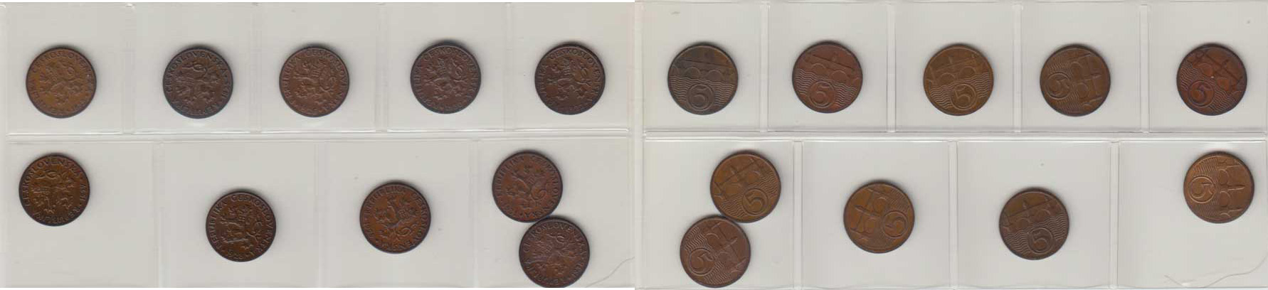 5 Haléř 1923, 1925-1932, 1938, KM.6 (CuZn), pěkná patina 10ks