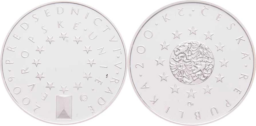 200 Kč 2009 - Předsednictví ČR v Radě EU, KM.105 (Ag900, 13.0g, 19.700ks), kapsle, etue, karta