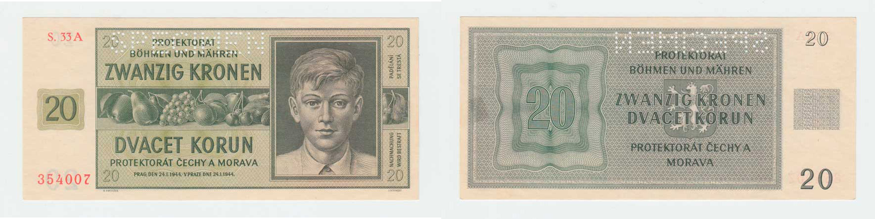 20 Koruna 1944 - sér. 33A, BHK.40a, He.43a.s1, nahoře perforace "SPECIMEN"