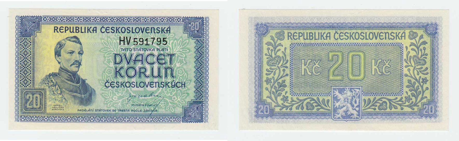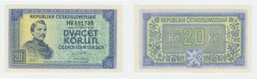 20 Koruna b.l.(1945), série HV, BHK.72, He.77a, "neperf."