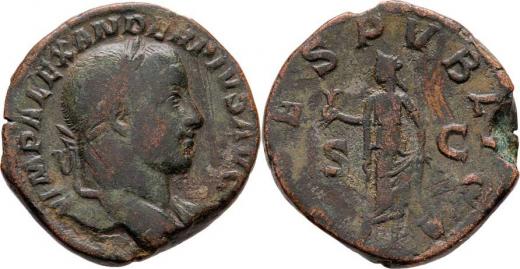 AE Sestercius, Rv:"SPES.PVBLICA.S.C." kráčející Spes, S.2168, RIC.648 - minc. Řím - ražba z let 231 - 235, velká vada materiálu na hraně, nedor., patina