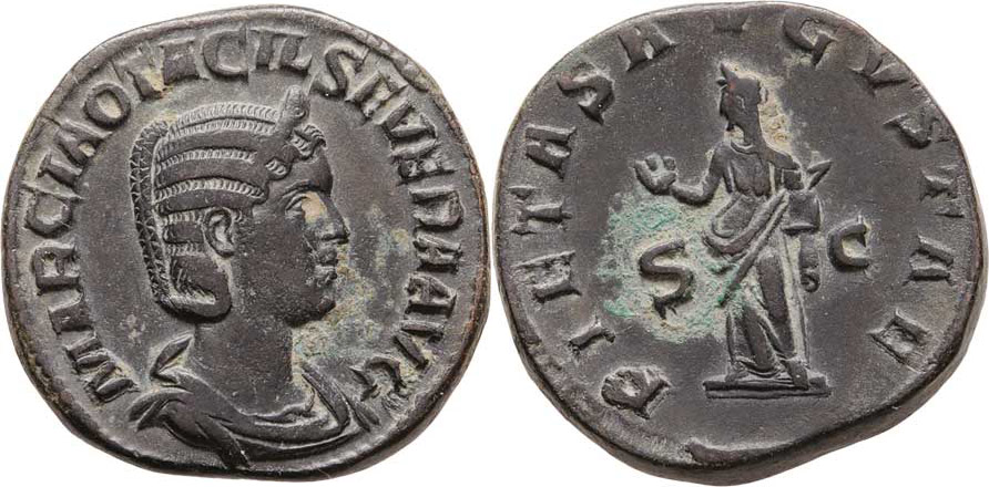 AE Sestercius, Rv:"PIETAS.AVGVSTAE.S.C.", stojící Pietas, S.2538, RIC.208a - mincovna Řím - ražba z let 244 - 249, skvrny, patina, téměř
