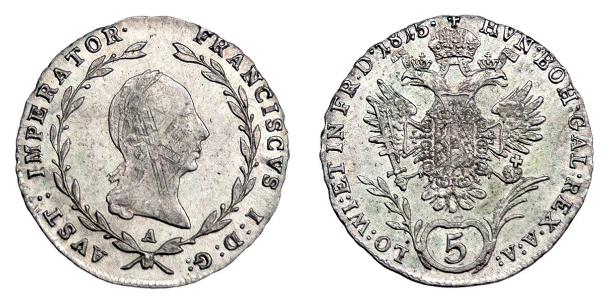5 Krejcar 1815 A, 2.251g, mírně just., pěkná patina, téměř