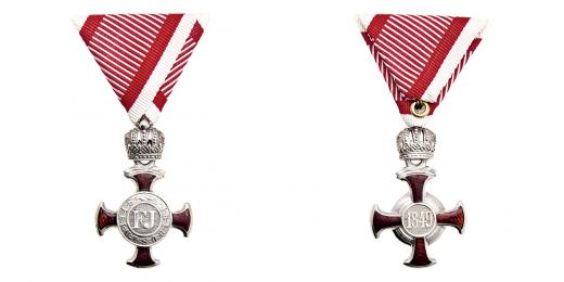 Stříbrný zásl.kříž s korunou, Marko.140c, VM.2/6-C-5, puncované Ag, výrobce Mayers-Söhne-Wien, poškozený smalt, nepůvodní stuha