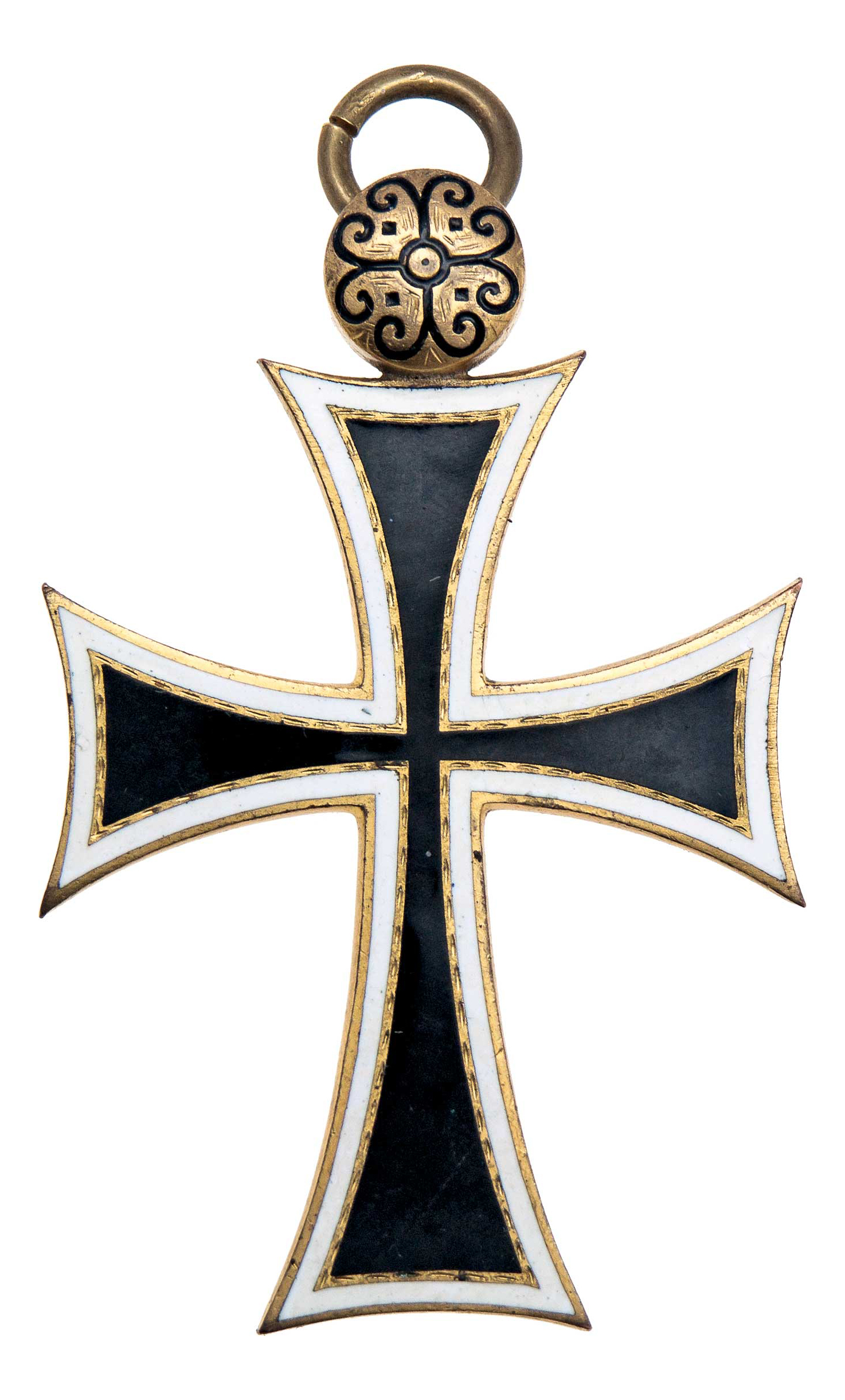 Náhrdelní profesní kříž řádového rytíře, Nesign., zlacený smaltovaný bronz 42x60 mm s malým kroužkem, chybí závěsný prstenec a stuha