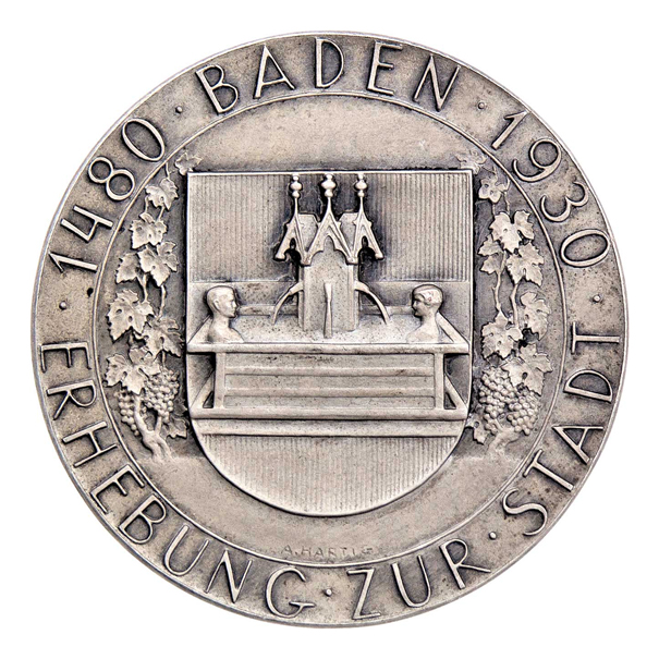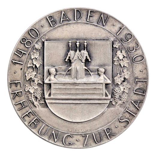 Baden - 450 let povýšení na město, 1480 - 1930 Poprsí císaře Friedricha III., opis / městský znak, vinná réva, opis, Sign., patinov. postř. bronz 41 mm