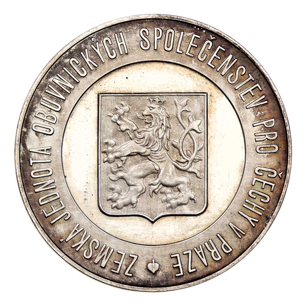 Zem.jednota obuvnických společenstev pro Čechy b.l. - český znak a opis / znak obuvnického cechu ve věnci, 2-řádkový nápis, Sign., pstříbřený bronz 43 mm, pat.