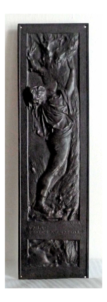 Vrba - jednostranná litá plaketa b.l. (1897) - muž objímající kmen vrby, zakletá žena, Sign., lité železo 162x590 mm, železárny Komárov, MZČ.200/6-pod.