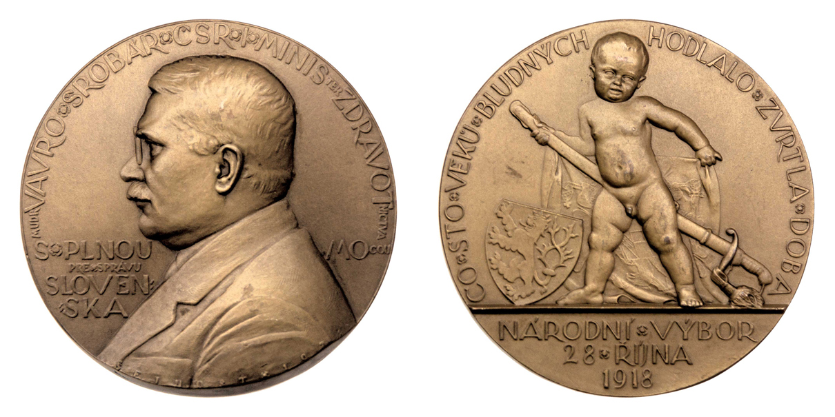 MUDr.Vavro Šrobár - první ministr zdravotnictví 1921 - poprsí zleva, opis / putti se šavlí a vlajkou, znak, opis a nápis, patinovaný bronz 60 mm