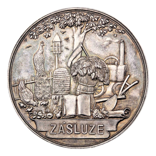 Hospodář.spolek okresu Sedlčanského - Zásluze b.l. - alegorie, nápis / koruna, girlanda a 5-řádkový nápis, Sign., Punc."SA", Ag 40mm, 18.804g, krásná patina
