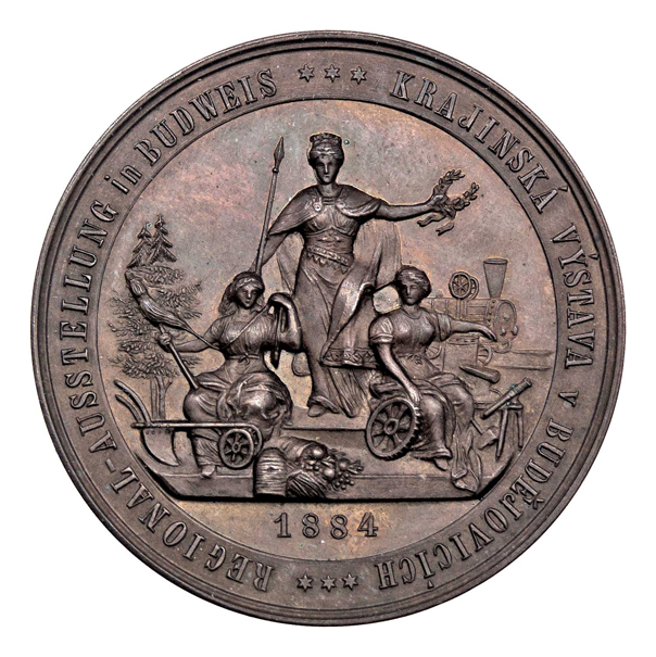 Christlbauer - Krajinská výstava 1884 - městský znak se štítonoši, věnec/ alegorie průmyslu a zemědělství, vročení, opis, Sign., bronz 44 mm, 41.746g, patina