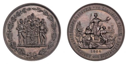 Christlbauer - Krajinská výstava 1884 - městský znak se štítonoši, věnec/ alegorie průmyslu a zemědělství, vročení, opis, Sign., bronz 44 mm, 41.746g, patina