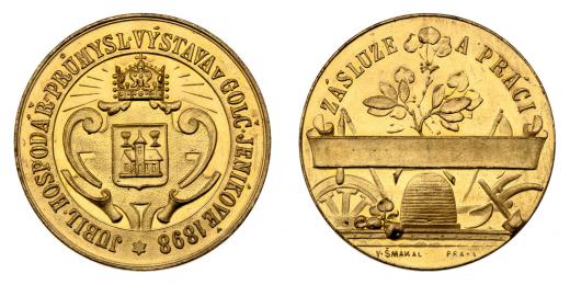 Šmakal - jubilejní hospodář.-průmyslová výstava 1898 - znak města v korun.kartuši, opis/ výstav. předměty, lipové snítky, opis, Sign., zlac.bronz 39 mm, etue