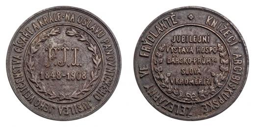 Jubilejní všeobecná hospodář.výstava 1908 - monogram "FJI" a vročení ve věnci, opis / 5-řádkový nápis ve věnci a opis, Nesign., lité železo 85 mm, pěkná pat.