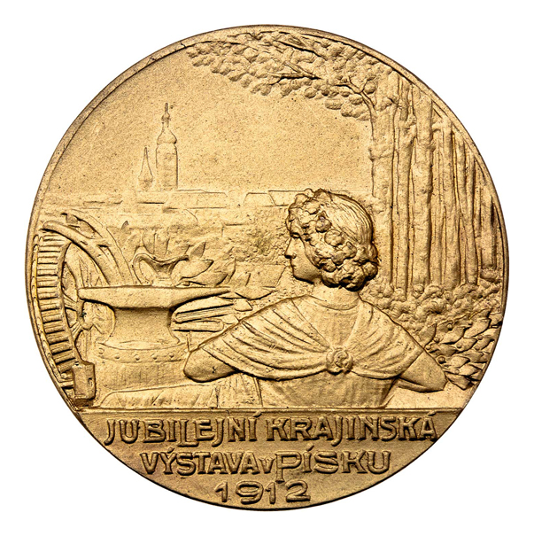 Karnet a Kyselý - jubilejní krajinská výstava 1912 - měst.znak, lípy, nápis / dívka s kovadlinou, stromy, pohled na město, nápis, Sign., zlac.bronz 45 mm, etue