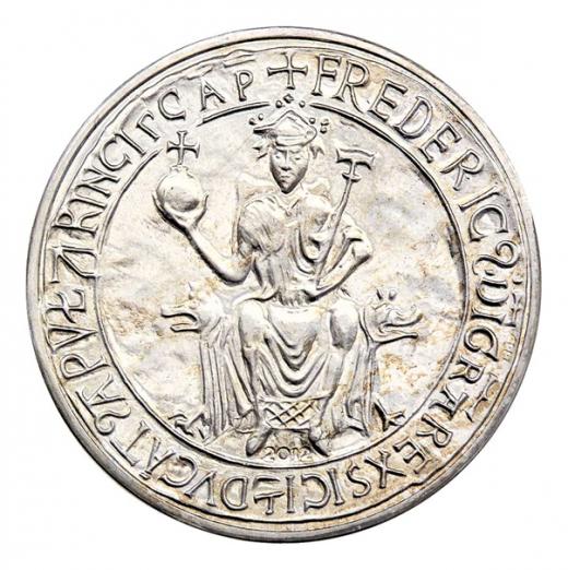 PF 2012 - Zlatá bula sicilská - líc pečeti císaře Friedricha II., opis / v paprscích jména vydavatelů, velké "PF" a opis, Sign., Ag925, 30mm, 13.886g R!
