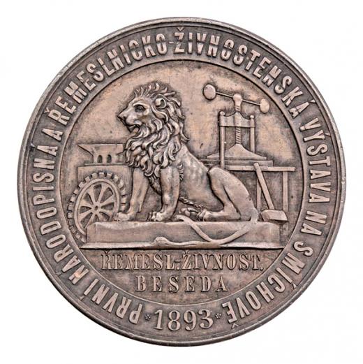 Abrahám - I.národop. řemesl. a živn. výstava 1893 - znak Smíchova, květinový ornament, nápis/ sedící lev, atributy, písmo, měď 50 mm, 45.851g, škr., patina