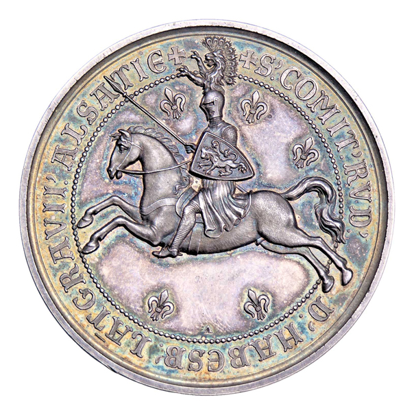 Rudolf I. Habsburský - AR pamětní medaile 1864 - král na koni doleva, pět lilií, latinský opis / 11-řádkový nápis, Nesign., 45mm, 44.377g, krásná patina R!