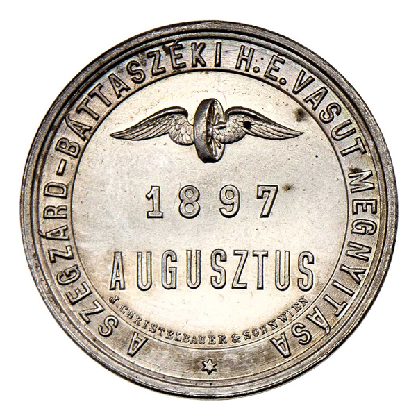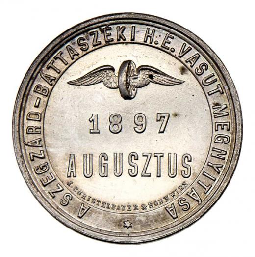 J.Horský - otevření železnice Szegzárd-Báttaszék 1897 - okřídlené kolo, nápis a opis / 5-řádkový nápis ve věnci, Sign.Christlbauer, postříbřený bronz 29 mm