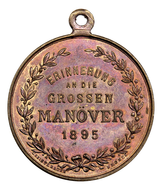 Císařské manévry (bez uvedení místa) 1895 - poprsí Fr.Josefa I., buben, prapory, latin.opis / něm.nápis ve věnci, M-B.27, zlac.bronz 32 mm s původ.ouškem