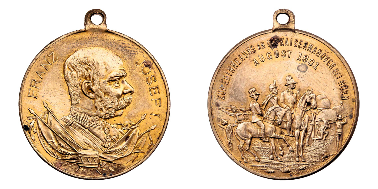 Horn 1901 - poprsí Fr.Josefa I. zprava, německý opis/ důstojníci na koních, 2-řádk. německý opis, Nesign., M-B.neuvádí, mosaz 29 mm s původním raženým ouškem
