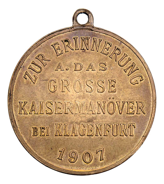 Klagenfurt 1907 - poprsí císaře Fr.Josefa zprava, něm.opis / důstojníci na koních, 2-řádkový něm.nápis, M-B.75, mosaz 29 mm s původním raženým ouškem, téměř